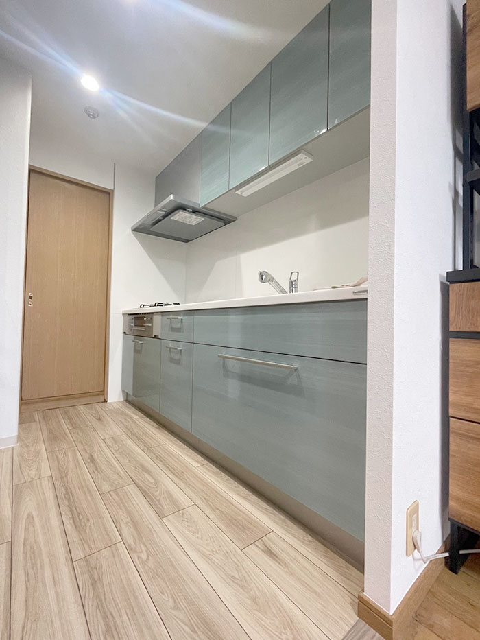 キッチン:トクラス Bb 間口2400mm(扉色:カームブルー) レンジフード:クリナップ フラットスリムレンジフード 間口750mm |